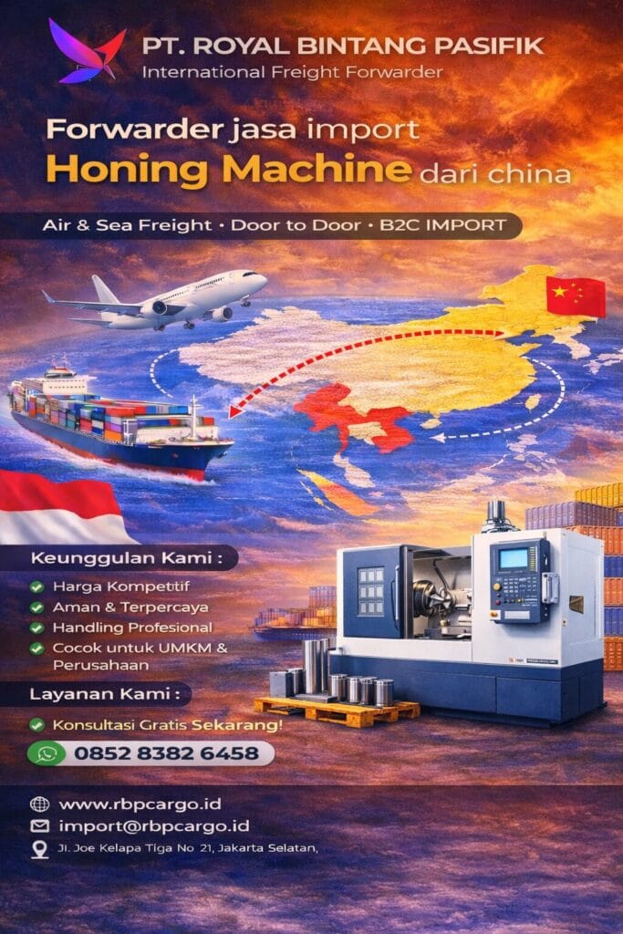 PT. Royal Bintang Pasifik (RBP Cargo) hadir sebagai forwarder jasa import Honing Machine dari China yang siap menangani pengiriman dari pabrik hingga mesin tiba di lokasi Anda.