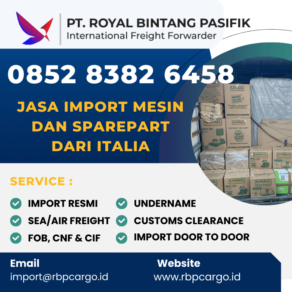 Melalui layanan jasa import mesin dan sparepart dari Italia, RBP Cargo membantu para pelaku usaha Indonesia—baik industri kecil maupun besar—untuk mengimpor mesin-mesin dengan aman, legal, dan efisien.