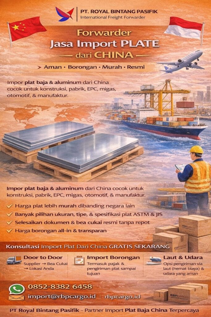 Kebutuhan plate (plat baja/logam) di Indonesia terus meningkat seiring berkembangnya sektor konstruksi, fabrikasi, manufaktur, shipyard, oil & gas, hingga proyek infrastruktur. Banyak perusahaan memilih import plate dari China karena harga yang lebih kompetitif, pilihan ukuran lengkap, serta ketersediaan stok besar.